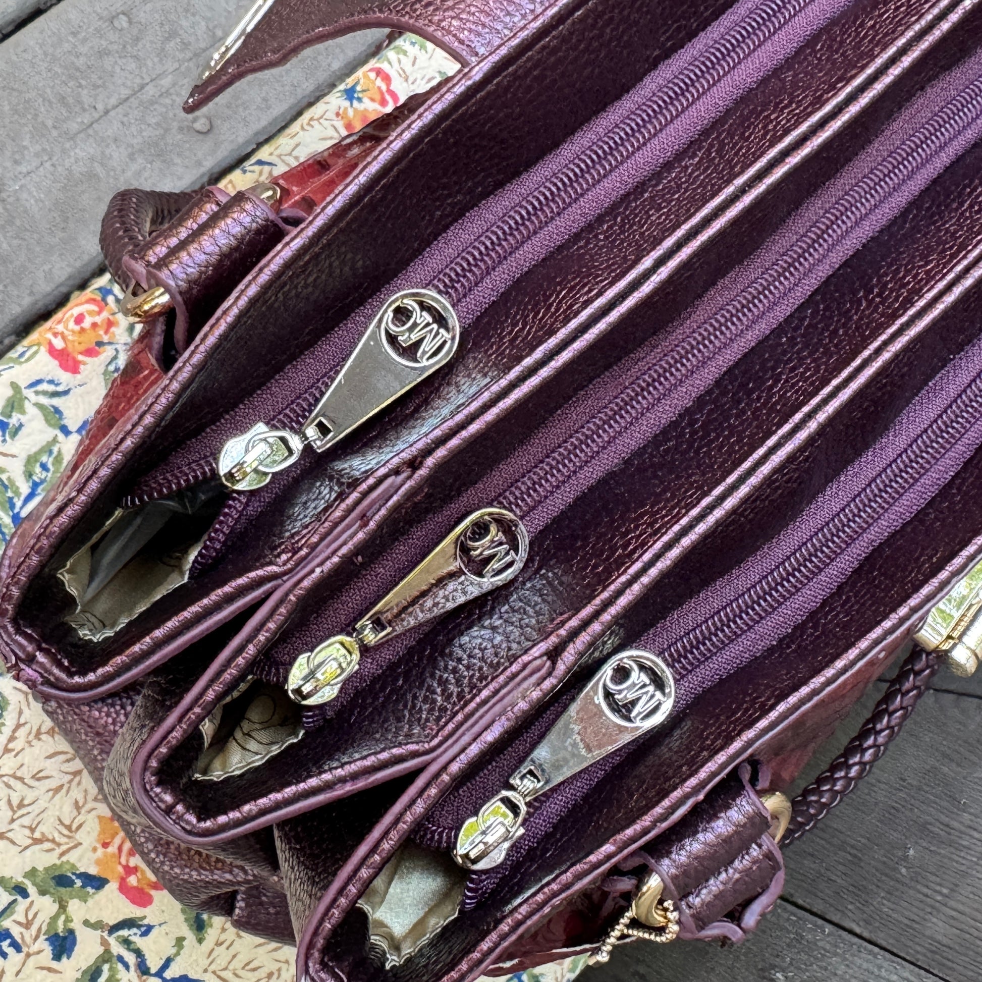 Three zippered compartments! Shiny clean interior, leather tassels! Excellent like new condition.
